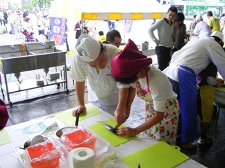 築 地 い ち ば 祭 り 魚食普及 築地市場が魚を安全で適正に取引していることを知ってもらい、 新鮮で美味しい本物の魚に触れてもらうことを目的に目的に開催された 築地市場関係者が一丸となったお祭りです 雨も上がって す ご い 人 出 ! 東京魚商は 築地お魚捌き方教室 来場の小学生に アジのさばき方を教えました 場所は築地市場内 東京魚商の茶屋(買荷保管所) 1回16名で一人に一人の魚屋さんがついて三枚おろしを教えます さばいたアジを叩いてつみれにて つみれ汁を食べてもらいました 子供たちはみんな美味しい!と大満足でした。 石狩鍋、ズワイガニの鍋も完売! 大盛況に終わりました。