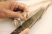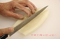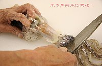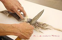 | 胴を包丁で開く。胴の上と下は包丁で切り落とす |