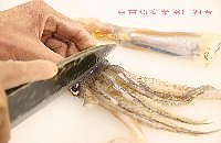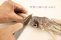 | いかは背側を上に置き、眼の上側を包丁でおさえ、胴のなかに指を入れて、胴と腕をはずす |