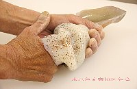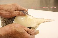 | 腕のつけ根に包丁を入れ、口(カラストンビ)を指で取りだす |