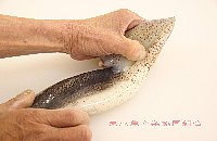 | ひれ(通称:えんぺら)を持ち、親指を間に入れて胴からはぎ取る |