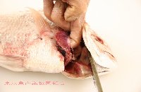 | かまの下を切り、エラに親指を入れてひっぱってつけ根を切る |
