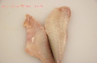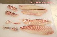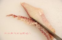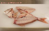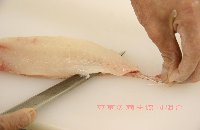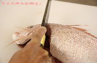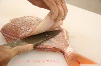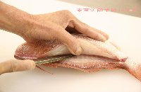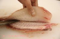 | 小骨を取り除くため、小骨の横に包丁を入れ、身を半分に切る |