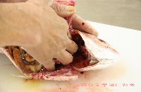 | 胸びれの下に包丁を入れ、裏返して同様に包丁を入れ、頭を落とす |