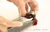 右側の腹身(盛りつけた時に下になる身)に切り目を入れ、内臓をかき出し、洗って水気を取る