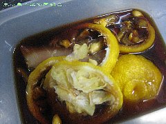 ゆずを薄切りにして、しょうゆ・みりん・酒をタッパー等で合わせ幽庵地をつくり冷蔵庫で寝かせた鰆を漬け込む。
