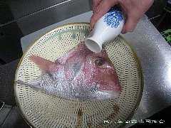 ザルに上げた鯛にうす塩をする