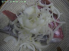 半分に割った頭をうろこ等良く取り除きザルに上げておく。