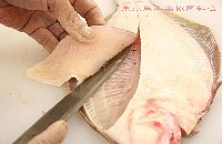 | 腹の少し後ろに切り目を入れ、身をめくりながら包丁を入れる |
